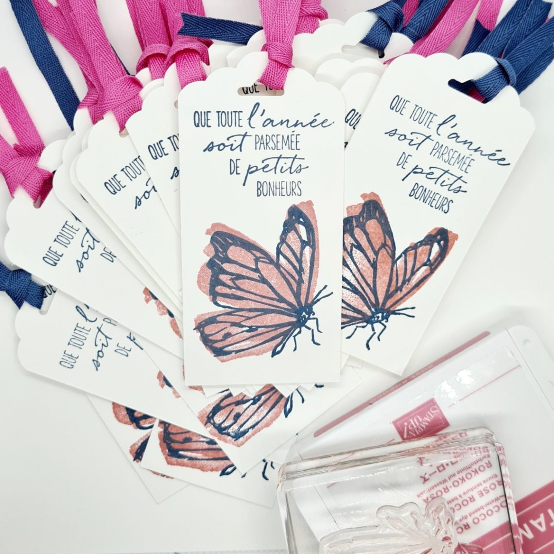 Bonjour, Voici des petits tags marque-page que j’ai offert à membres de mon équipe pour leur souhaiter une très belle et heureuse année 2021. J’aime beaucoup le résultat ! Les papillons plaisent toujours et avec le set Une touche d’encre c’est un vrai régal de jouer avec la superposition des couleurs. J’ai choisi les couleurs mystérieuse brume et rose rococo. Et le souhait vous le retrouverez sur le set de tampons libellule au jardin. Pour retrouverez les produits utilisés dans ce projet rendez-vous sur ma boutique en ligne : ici . Belle journée,