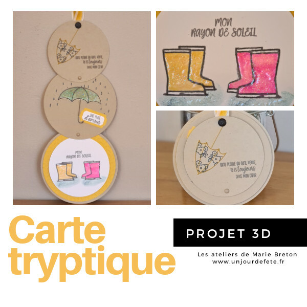 Voici une la carte réalisée lors de mon dernier atelier du mois de septembre. Trois cercles de taille différente compose cette carte. Il suffit de les accrocher ensemble avec des attaques parisiennes. Le résultat est top : une carte triptyque.